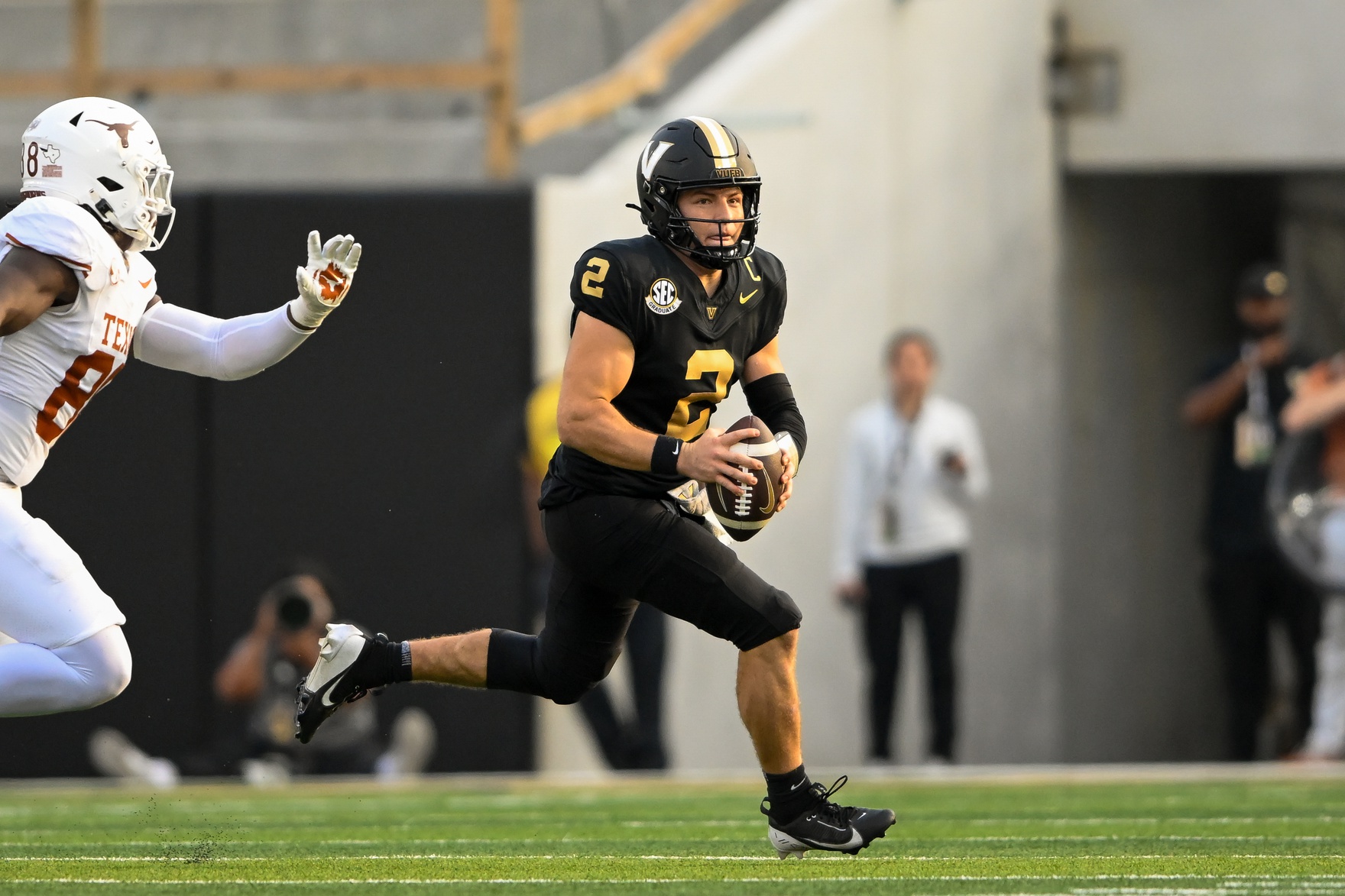 Oct 26, 2024; Nashville, Tennessee, USA; Vanderbilt Commodores quarterback Diego Pavia (2) scrambles against the Texas Longhorns during the first half at FirstBank Stadium. Mandatory Credit: Steve Roberts-Imagn Images