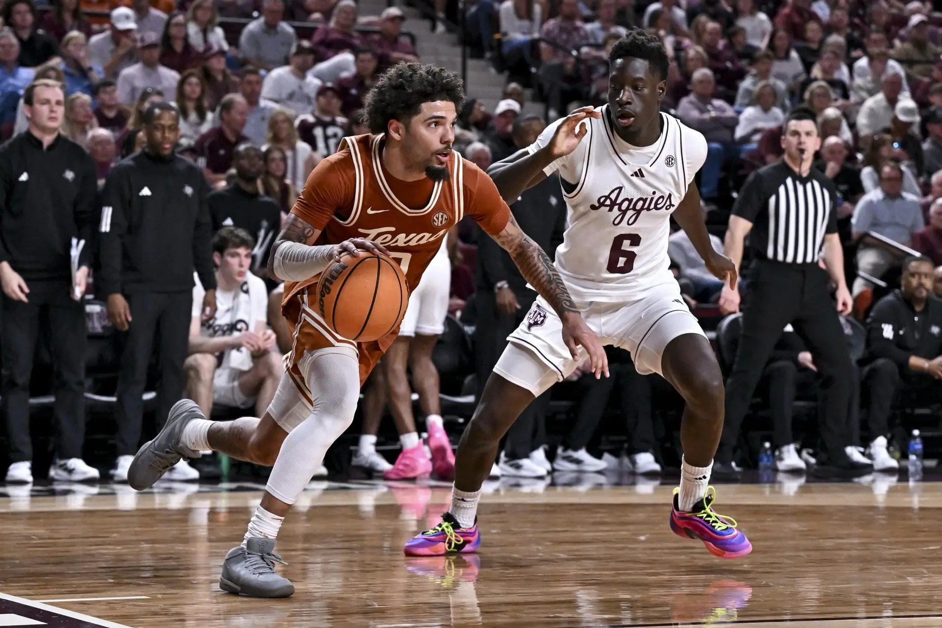 Feb 28, 2026; College Station, Texas, USA; Texas A&M Aggies guard Ali Dibba (6) pressures Texas Longhorns guard Jordan Pope (0) during the second half at Reed Arena. Mandatory Credit: Maria Lysaker-Imagn Images